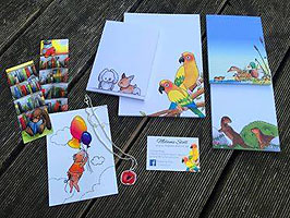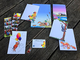 handgemaltes, illustriertes Set bestehend aus 1x Block in DIN A5, 4x Block in DIN A6, 2x Lesezeichen ,1x Postkarte, sowie 1x Schlüsselanhänger von Melanie Stoll Gespendet von: Melanie Stoll |